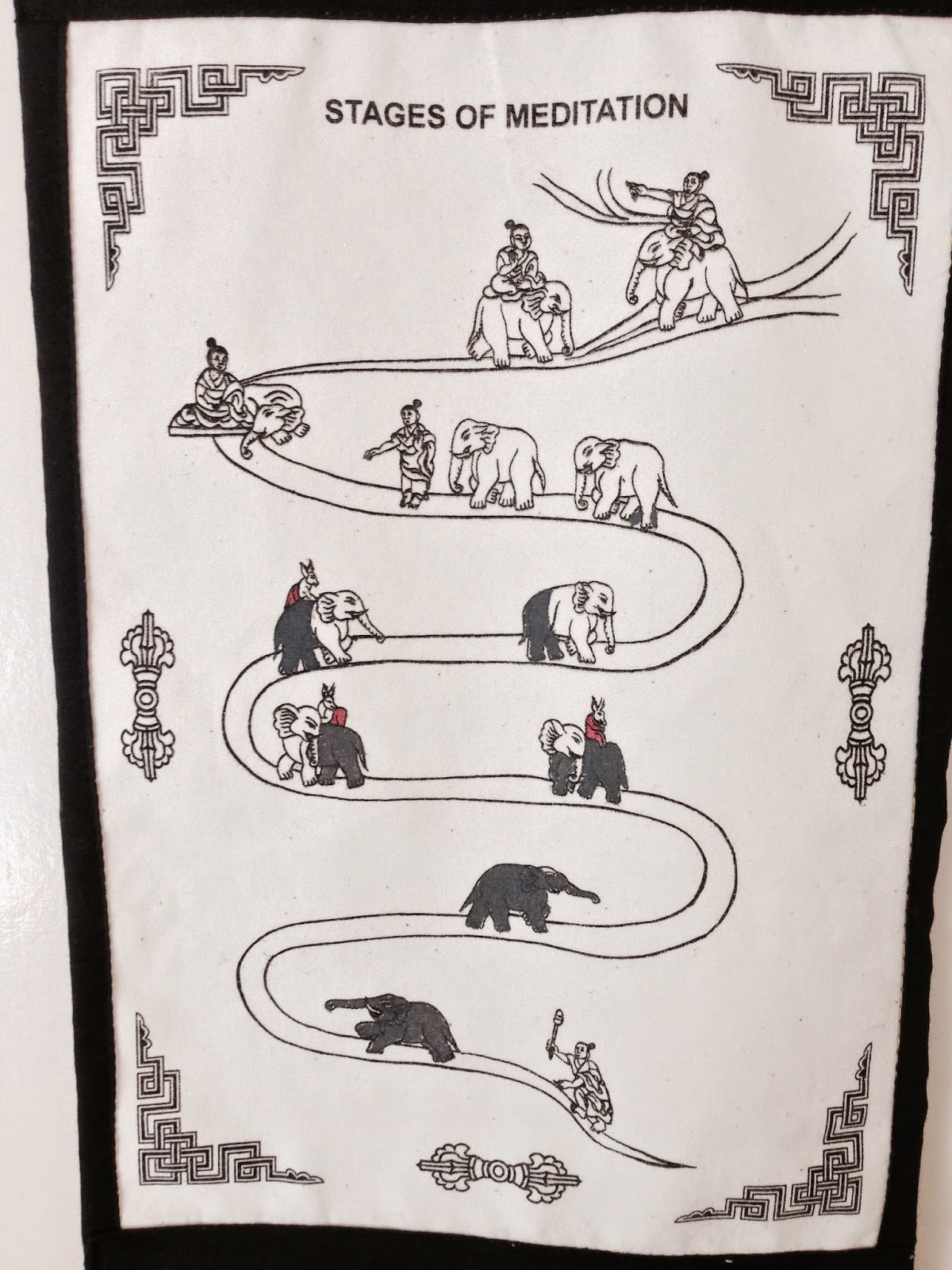 Now Elephant mind is awake enough for training, meets teacher, which I am going to presume is itself metaphorically, (maybe the buddha), but I'll stick with self, the mind and body type metaphor, but the elephant now being a mind that is ready for training, the trainer person is the effort of the mind training itself