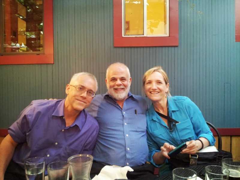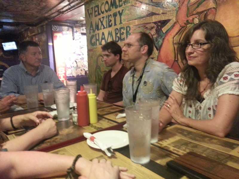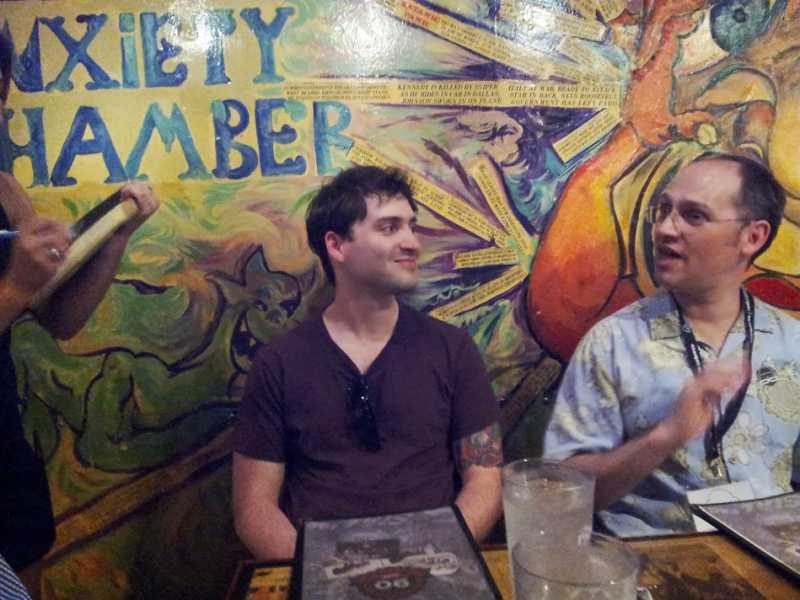 Now I'll do a few photo postings, beginning this with one: Nadav and Dan Ingram in our favorite restaurant (because it's large and close to UC Boulder) The Sink. And yes, the writing on the wall does say in full ANXIETY CHAMBER.