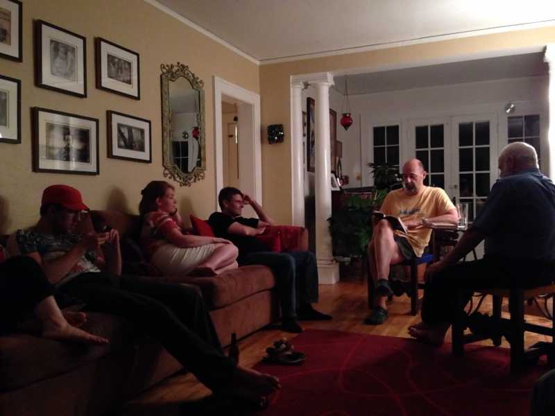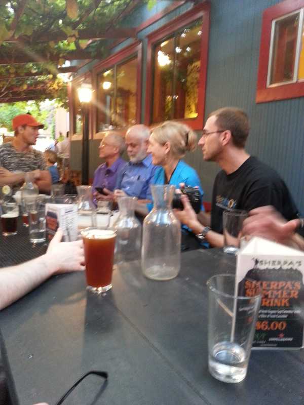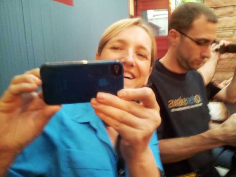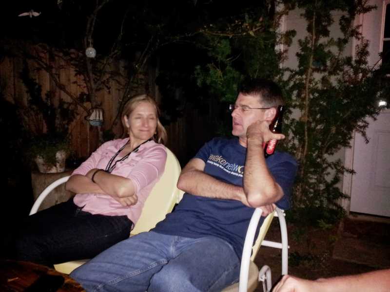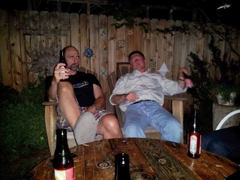 BLINDED BY THE LIGHT! In complete disregard for the Buddhist precept to Do No Harm, I brazenly blind people with the flash of my cell camera as we all sat amidst the greenery of the backyard drinking beer after a long day of Buddhist Geekery.