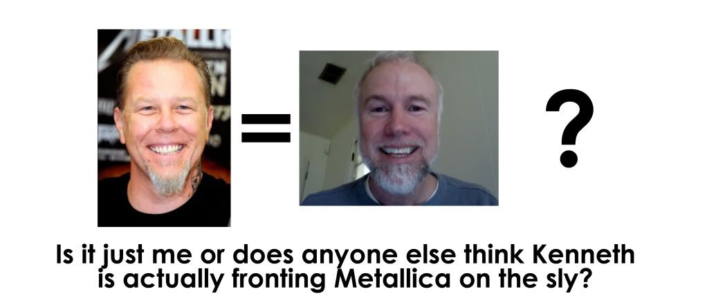 I was watching Metallica live the other night and noticed that James Hetfield bears an uncanny resemblance to Kenneth......I mean, I'm not one to start rumours or anything but could Kenneth's recent cancellation of his NYC meetings be down to his current touring schedule? He could be Skyping us from the tour bus one minute, and tearing out a ripping cover of Motorheads' "Damage Case" the next for all we know!