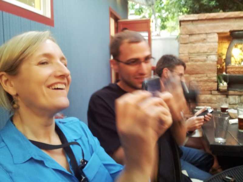 BLINDED BY THE LIGHT! In complete disregard for the Buddhist precept to Do No Harm, I brazenly blind people with the flash of my cell camera as we all sat amidst the greenery of the backyard drinking beer after a long day of Buddhist Geekery.